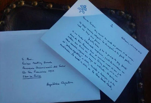 La carta escrita de puño y letra del Papa, dada a conocer por la agencia AICA, fue dirigida al Padre Enrique Martínez, párroco de la Anunciación del Señor, en el barrio Cochangasta, de la diócesis de La Rioja en Argentina.