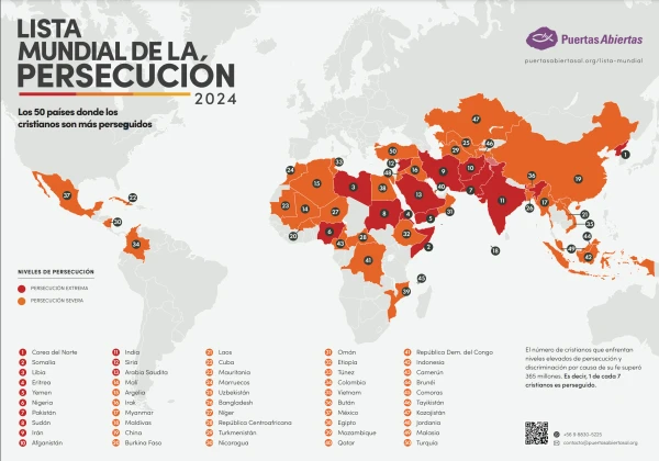 En 13 países del mundo los cristianos sufren persecución extrema, según la Lista Mundial de la Persecución 2024 publicada por la organización Open Doors (Puertas Abiertas), cuya misión es atender a los fieles en aquellas naciones donde exista algún tipo de amenaza contra sus vidas o contra su libertad de creer y rendir culto a Jesús.