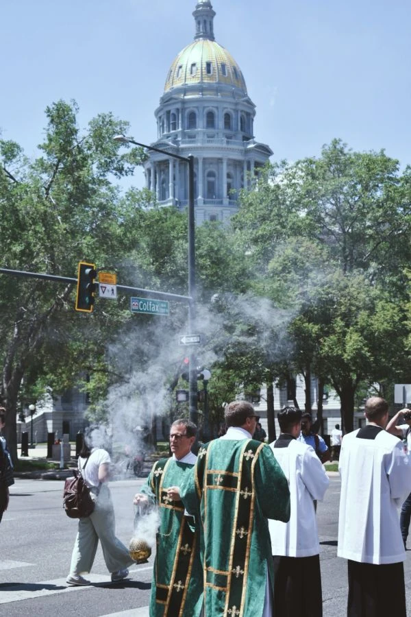 Más de la mitad del recorrido, la procesión se detuvo frente al edificio del capitolio del estado de Colorado, sobre el que colgaba una bandera del orgullo gay. El arzobispo elevó la custodia en bendición mientras los asistentes se detenían para observar y rezar.