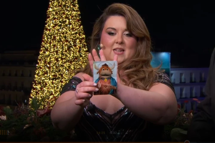 La presentadora de las campanadas del fin de año en Televisión Española, mostró durante la trasmisión una estampita irreverente en la que se podía ver a la mascota de un conocido programa retratada como un Sagrado Corazón de Jesús.