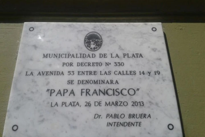 El Papa Francisco tiene desde el mediodía de este martes 26 de marzo una calle con su nombre en el entramado urbano de la ciudad de La Plata. Así lo decidió el intendente Pablo Bruera, al firmar un decreto aprobado por el Concejo Deliberante de la capital bonaerense, y quedó efectivamente inaugurada luego de que el Arzobispo de La Plata, Mons. Héctor Aguer, bendijera una placa en la esquina de la Avenida 53 y la calle 14.