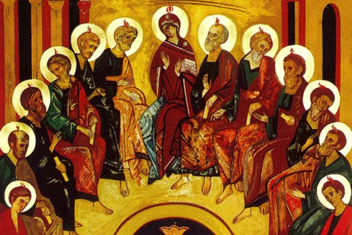 A los apóstoles y a la Virgen María "se les aparecieron unas lenguas como de fuego que se repartieron y se posaron sobre cada uno de ellos; quedaron todos llenos del Espíritu Santo y se pusieron a hablar en otras lenguas, según el Espíritu les concedía expresarse".