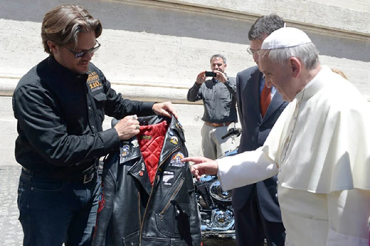 El miércoles en la audiencia general el Santo Padre recibió como obsequio dos de estas motocicletas y una chaqueta de cuero negro.