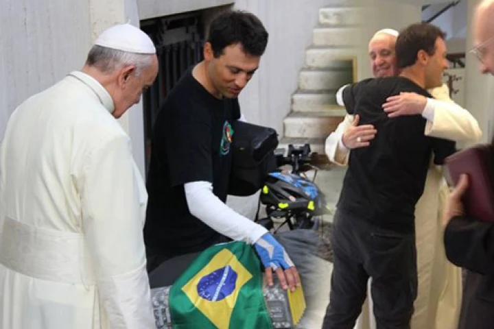 El Papa Francisco recibió a Leandro Martins, un joven brasileño que recorre el mundo en bicicleta y que fue recibido por el Pontífice luego de la Misa en la Casa Santa Marta. Ambos compartieron un ameno y distendido encuentro en el que el joven le mostró su vehículo, en el que según relató, prácticamente "vive".