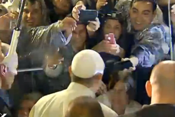 "Que Dios los bendiga", expresó el Santo Padre luego que Reina, en medio del alboroto de la gente, lograra acercarse al Pontífice y decirle "¡Papa Francisco, un saludo para el Perú que lo escucha!".