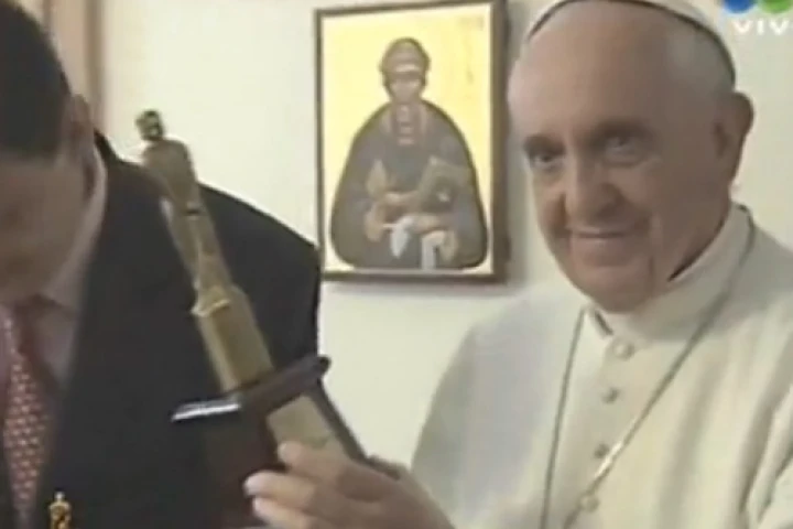 El Santo Padre recibió el premio de parte del director general del Canal 21, Julio Rimoldi, que viajó al Vaticano con la estatuilla de Martín Fierro, el mítico gaucho que le da nombre al galardón.