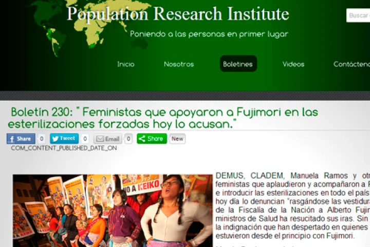 Quien hace la denuncia es la Oficina para América Latina del Population Research Institute (PRI), que en su último boletín señala que "DEMUS, CLADEM, Manuela Ramos y otras organizaciones feministas que aplaudieron y acompañaron a Fujimori para legalizar e introducir las esterilizaciones en todo el país entre 1996 y 1998, hoy día lo denuncian 'rasgándose las vestiduras'".