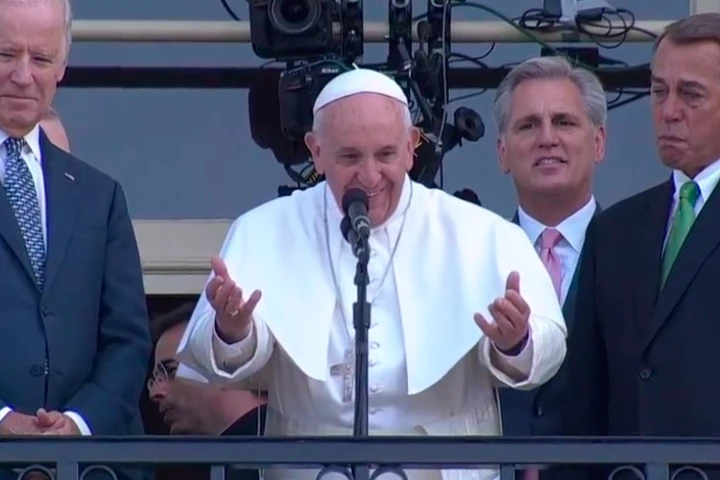 Al concluir su histórico discurso en el Capitolio de Estados Unidos, el Papa Francisco se asomó a uno de los balcones del ala oeste para dirigirse a la multitud que lo esperaba en los jardines a quienes impartió una especial bendición.
