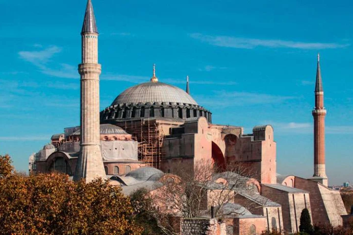La basílica de Santa Sofía se construyó en el siglo VI por orden de Justiniano I, emperador del Imperio Romano de Oriente, sobre construcciones anteriores de la época de Teodosio II y de Constantino I. En 1453, tras la conquista Otomana de los últimos restos del imperio, la basílica se convirtió en mezquita. En 1935, tras unos años cerrada, fue transformada en museo como símbolo de la nueva república turca en contraposición al desaparecido imperio otomano.