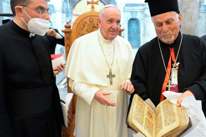 El Santo Padre entregó el libro sagrado, conocido como Sidra, a Mons. Yohanna Butros Mouché, Obispo de Mosul, durante el evento realizado en la iglesia de la Inmaculada Concepción en Qaraqosh.