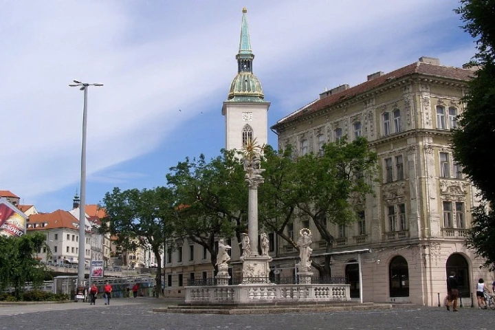 A inicios de la segunda década del siglo XVIII, para conmemorar el fin de la gran plaga que azotó Bratislava y dejó casi 4 mil fallecidos y más de 1500 infectados, se construyó en el centro de la actual Plaza Rybné námestie, una columna de piedra barroca denominada "Morovy Stlp".