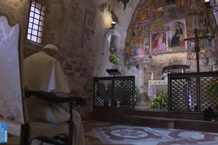 El Papa Francisco viajó a Asís este viernes 12 de noviembre y rezó en silencio en la Porciúncula que se encuentra en el interior de la Basílica de Santa María de los Ángeles en Asís.