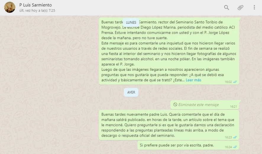 A través de WhatsApp, el lunes 27 ACI Prensa contactó al P. Sarmiento y le explicó la inquietud de varios feligreses por las fotografías. El mensaje fue leído, pero no hubo respuesta.