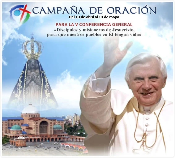 Ya cercanos a la V Conferencia General, los convocamos a unirse a la campaña de oración, para que el Espíritu Santo ilumine a nuestros Pastores y a todos los que participarán en este gran acontecimiento para nuestra Iglesia que peregrina en América Latina y el Caribe. En nuestra oración, encomendemos especialmente a S.S. Benedicto XVI que viajará a Aparecida para inaugurar la V Conferencia.