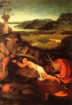 La vida contemplativa y el retiro de los hombres al bosque para convertirse en ermitaños fue una práctica muy extendida en la Edad Media y que el Bosco exalta todavía como modelo ya en el siglo XVI. Esta escena recuerda en su composición e intención al San Juan Bautista meditando. San Jerónimo fue el santo que siendo cardenal, abandonó la pompa de la Iglesia para huir al monte y rezar a Dios. Así, junto al cuerpo delgado y maltratado del cardenal vemos su ropas rojas abandonadas, en similitud con la calabaza roja, hueca, podrida, que flota en las aguas putrefactas de un estanque. Es un símbolo de la vanidad del mundo. El santo está tendido de bruces, con un crucifijo entre los brazos. Le acompaña el león, su atributo, pero reducido al aspecto de un tímido gatito doméstico que bebe agua. Algunas formas fantásticas, misteriosas, rodean el lugar de meditación del santo, invenciones maléficas que tratan de distraer la atención del orante. En el árbol donde San Jerónimo ha dejado sus ropas, dos pájaros simbolizan respectivamente la herejía (la lechuza) y la lucha contra la herejía (el pájaro carpintero).