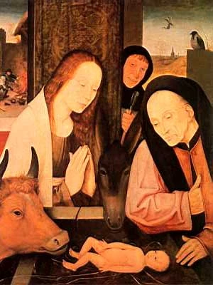 Esta bonita Natividad es una atribución dudosa al Bosco, aunque resulta de una gran calidad. El autor ha realizado una interpretación muy convencional del tema, con el Niño adorado en el centro, sus padres a ambos lados simétricamente colocados y un fondo de paisaje. Sin embargo, otros elementos se salen de la tradición, como es el personaje que asoma por detrás del dosel brocado de María. En la mano lleva una herramienta de carpintero, pero su rostro riente y el gorro le han identificado a veces con un bufón. En cualquier caso, parece un alma simple, algo estúpido y observa el nacimiento del Mesías con evidente descreimiento. También llama la atención poderosamente la atractiva escena de la izquierda, en la que unos labriegos han encendido un fuego para calentarse. El naturalismo es de un aire tan cotidiano y espontáneo, que vemos con humor cómo uno de ellos se ha descalzado y aproxima el pie al calorcillo de la hoguera.