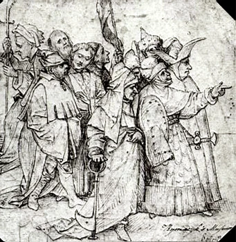 El Bosco es el posible autor de este dibujo, que nos muestra una comitiva o procesión de extraños personajes, armados algunos de ellos y con extrañísimas vestiduras. Desconocemos de quiénes se tratan, aunque podrían ser una de las comitivas que acompañan las Subidas al Calvario de su autor.