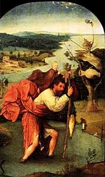 Ante las dudosas interpretaciones a las que se prestan normalmente las pinturas del Bosco, en este caso el sentido parece evidente: un hombre gigantesco con un niño a su espalda no puede ser sino San Cristóbal, cuyo nombre significa "portador de Cristo". La historia de San Cristóbal procede de la Leyenda Dorada y de diversas historias populares alemanas. Toda su historia está reflejada en el paisaje: San Cristóbal era un soldado, mercenario, que entró al servicio del señor más poderoso que encontró, es decir, el demonio. Este demonio era el dragón que se encuentra en el castillo, al fondo a la izquierda. Sin embargo, un ermitaño que encontró a la orilla de un río le informó de que el señor más poderoso que existía era Dios. El soldado, incrédulo, encontró a un niño que le pidió que le pasara el río a hombros. Cristóbal, riendo, tomó al niño para cruzarlo, pero su peso era como el plomo y reconoció que aquel era Jesús, poderoso aunque de aspecto débil. El peso de Jesús se interpreta habitualmente como el peso del mundo y sus tentaciones sobre el ánimo de los cristianos. Cristóbal abandonó al dragón, que aparece persiguiendo a un hombre desnudo. También abandonó los placeres del hombre de armas, como es la caza, lo que podemos reconocer en el cazador que tras abatir a un oso con sus flechas lo ahorca. El ermitaño que aconsejó a Cristóbal está, efectivamente, en la orilla. Sobre él, una jarra y una colmena, símbolo de la vida del eremita pero también de las tentaciones de lascivia. Por último, el pescado colgando del bastón de Cristóbal es el símbolo de la cuaresma y la conversión.