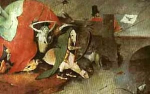 Dos detalles del panel interior situado a la derecha del conjunto. El tríptico cerrado presenta en el ala izquierda el prendimiento de Cristo, y en la derecha a la Verónica, ambas en grisalla. Abierto, presenta a la izquierda, el vuelo de San Antonio Arrastrado por los demonios y el santo socorrido por sus compañeros tras la caída; las tentaciones y, a la derecha la meditación del santo. La figuración central, muy compleja, se centra en una mesa puesta, junto a la cual se encuentra San Antonio de rodillas señalando la capilla del fondo, donde aparece Cristo que a su vez señala el Crucifijo; alrededor se desarrolla la kermés satánica, cuyos protagonistas podrían ser personificados por los pecados. El rigor de las tentaciones prodiguen en el tercer compartimiento, sin embargo, el Santo aparece ya definitivamente inmerso en una consiente serenidad, que se manifiesta así mismo en la distinción de los elementos en zig- zag, de los planos opuestos y en la amplitud del horizonte, mucho más "real" y convincente que la del lateral opuesto.