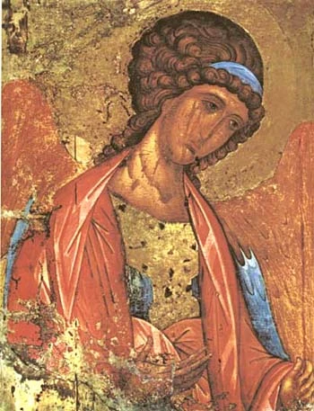 El bastón de mensajero en su mano izquierda y sus alas, simbolizan su misión de "enviado de Dios". Se trata de uno de los iconos raros que pueden atribuirse a la mano de Andrei Rublev, gracias a ciertos números de pruebas.