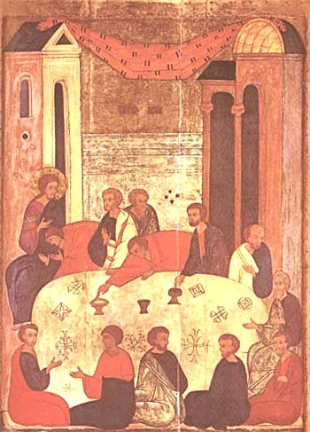 Contrariamente a todas las reproducciones occidentales de la Cena, el icono acentúa el lado dramático del suceso de forma especialmente sorprendente gracias a la emoción y a la agitación que se leen en todos los rostros de los participantes.