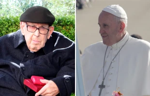 Antes de celebrar la Misa por los 100 años de las apariciones de la Virgen de Fátima y la canonización de los santos Jacinta y Francisco Marto, el Papa Francisco saludó al P. Joaquim Pereira da Cunha, el sacerdote más anciano de Portugal.
