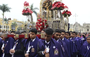 Un grupo de niños y jóvenes en la ciudad de Lima, Perú, sacó en procesión una pequeña imagen del Señor de los Milagros, una de las devociones religiosas más apreciadas en el país.