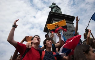 Las banderas de varios países del mundo ondean en este lugar. Los jóvenes se saludan aunque no se conozcan o no hablen el mismo idioma, se preguntan de dónde son, se toman fotos e intercambian algún distintivo. Cantan y rezan juntos en un ambiente de alegría.