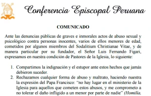 La Presidencia de la Conferencia Episcopal Peruana (CEP) dio a conocer un comunicado ante las acusaciones contra el fundador del Sodalicio de Vida Cristiana, Luis Fernando Figari, sobre abusos físicos, psicológicos y sexuales, que actualmente son investigadas por el Vaticano y fueron recientemente difundidas en distintos medios de comunicación.
