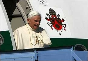 El Papa Benedicto XVI saluda mientras baja del avión luego de llegar al aeropuerto de Münich. El Papa llegó a la región sur de Alemania, Baviera, donde inició una peregrinación de seis días por los lugares que marcaron su vida.