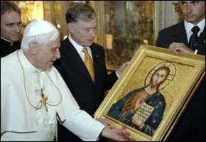 El Santo Padre recibe un regalo del Presidente alemán, Horst Koehler (centro) en el Palacio Real de Münich.