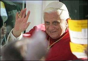 El Papa Benedicto XVI saluda desde el papamóvil a su llegada al santuario de Altötting, al sur de Alemania, a 70 km. al este de Münich. El Papa alemán realiza una visita de seis días a su tierra natal.