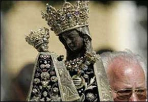 La venerada estatua de la Virgen Negra, a la que se atribuyen varios milagros, es cargada por sacerdotes durante la procession que siguió a la celebración de la Misa al aire libre presidida por el Papa Benedicto XVI en Altötting.