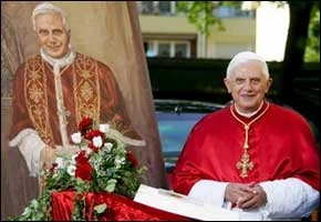El Papa Benedicto XVI posa junto a una pintura que lo representa. Los ciudadanos de Altötting le regalaron este cuadro.