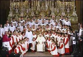 El Papa Benedicto XVI posa para una foto oficial con el Coro de la Catedral de Ratisbona, luego del rezo de Vísperas.