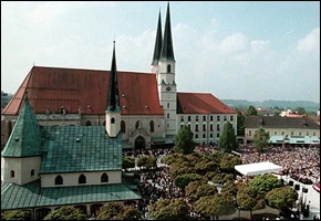 Benedicto XVI llegará al Santuario de Altötting el tercer día de su estadía en Baviera. La Plazuela delante de la Capilla de la Gracia es el lugar en donde se acostumbra celebrar las misas al finalizar las peregrinaciones que muchos hacen a este santuario. |