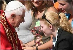 El Papa Benedicto XVI es saludado por un grupo de jóvenes mientras deja la Catedral de Freising, al sur de Alemania. Los fieles desplegaron pancartas y escribieron en las aceras el nombre de Benedicto XVI con flores. En esta catedral el Papa fue ordenado sacerdote en 1951, hace más de medio siglo.