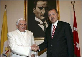 El Papa Benedicto XVI saluda al Primer Ministro Turco, Tayyip Erdogan ante el retrato de Mustafa kemal Ataturk, fundador del la Turquía moderna, a su llegada al aeropuerto Esenboga en Ankara, el 28 de noviembre de 2006.