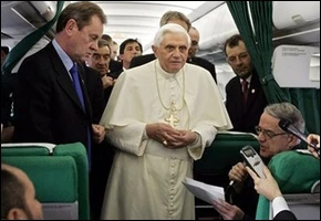 El Papa Benedicto XVI se dirige a los periodistas a bordo del avión que lo llevó a Turquía.