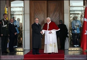 El Presidente turco Ahmet Necdet Sezer y el Papa Benedicto XVI posan para las cámaras luego de su llegada al Palacio Cankaya en Ankara. El Pontífice señaló que el objetivo de su visita a Turquía es promover el diálogo y crear puentes, minutos antes de partir en su primer viaje como Pontífice a un país de mayoría musulmana.
