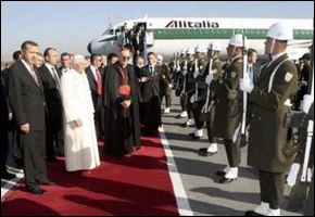 El Papa Benedicto acompañado por el Primer Ministro turco Tayyip Erdogan mientras pasan revista a la guardia de honor a su llegada al aeropuerto Esenboga en Ankara, el 28 de noviembre de 2006.