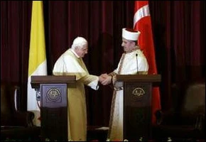 El Papa Benedicto XVI recibe la bienvenida de Ali Bardakoglu, Presidente del Directorio para Asuntos Religiosos de Turquía en Ankara, 28 de noviembre de 2006.