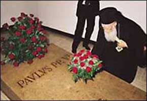 Bartolomé I ante la tumba de Pablo VI durante su visita al Vaticano en 2004.