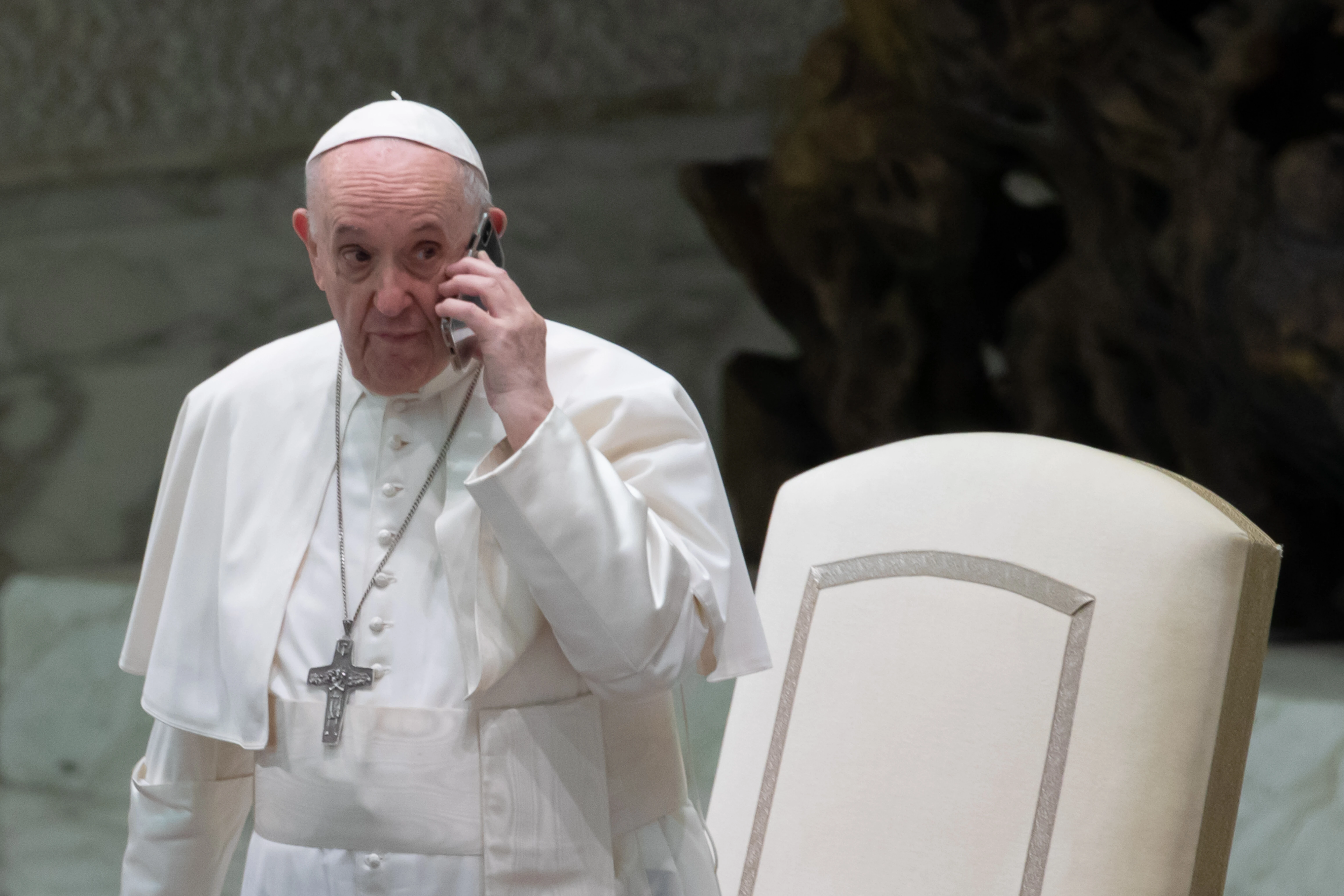 El Papa Francisco coge una llamada durante una Audiencia General el 8 de noviembre de 2021 Crédito: Daniel Ibáñez/ACI Prensa