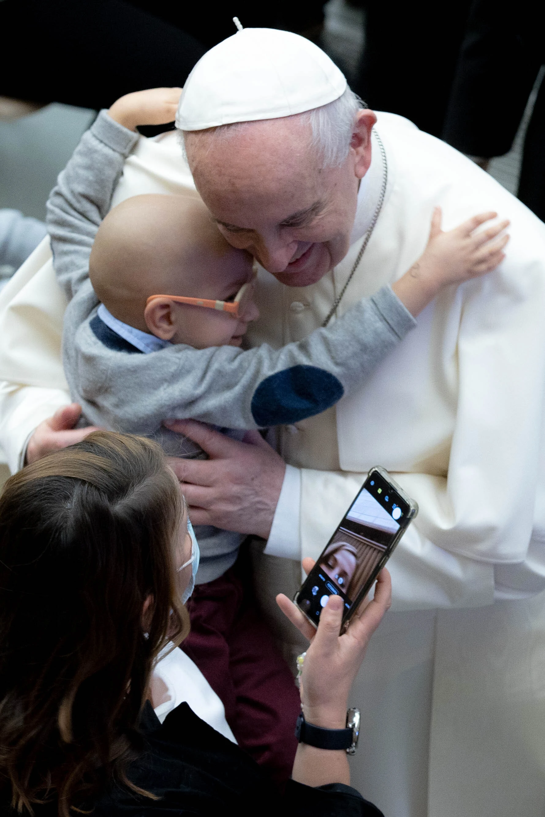 Cariñoso abrazo entre el Papa Francisco y un niño con cáncer durante una Audiencia General. Crédito: Daniel Ibáñez/ACI Prensa