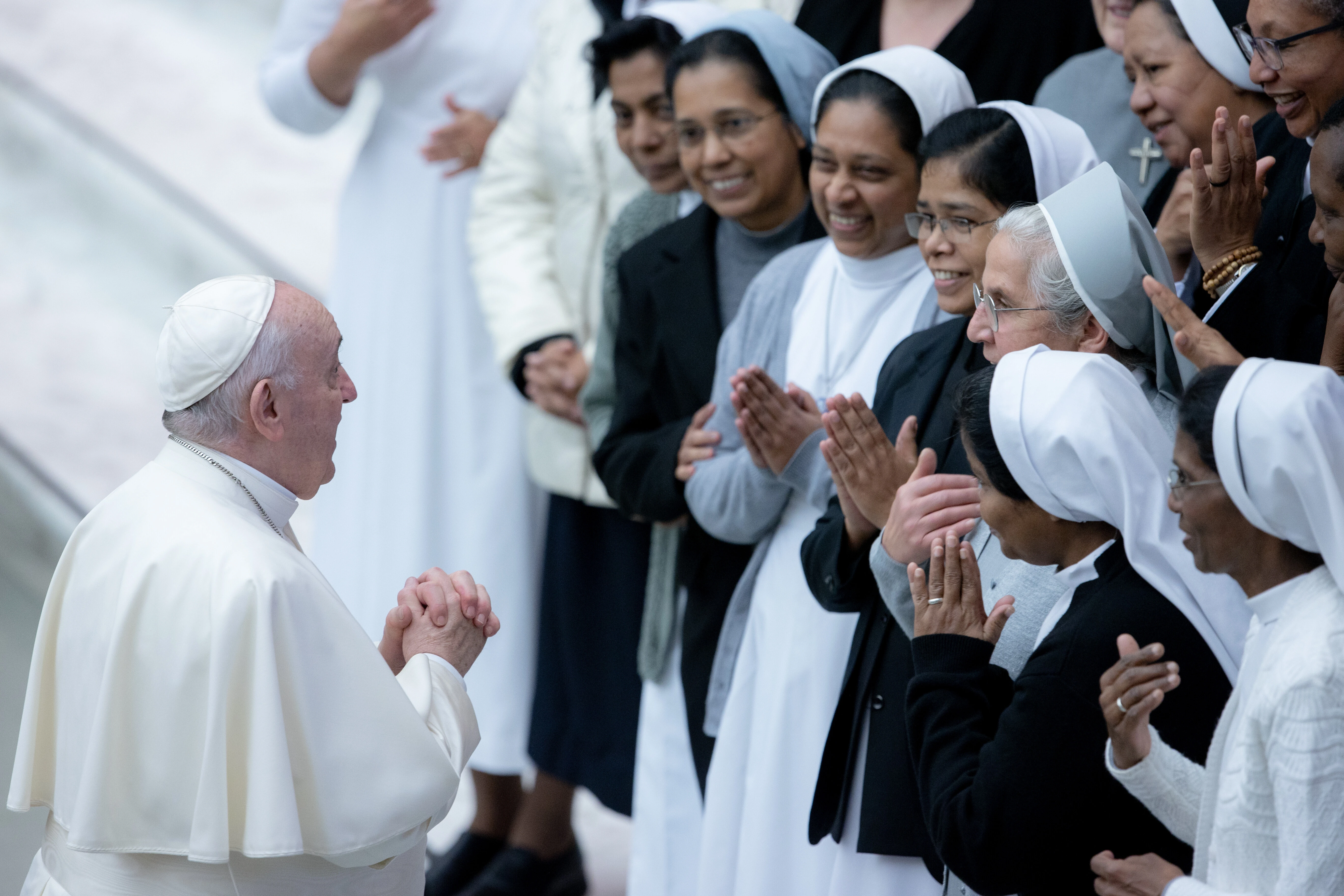Tierna imagen en la que el Papa Francisco reza junto a un grupo de religiosas en el Vaticano. Crédito: Daniel Ibáñez/ACI Prensa