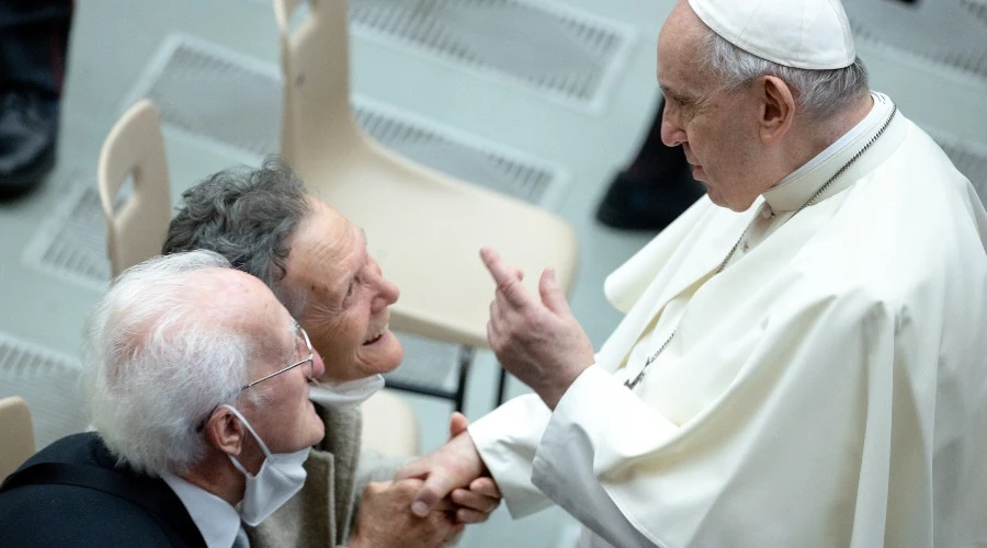 El Papa Francisco conversa con una pareja de ancianos tras la Audiencia General donde centró su catequesis en el valor de la vejez. Crédito: Daniel Ibáñez/ACI Prensa