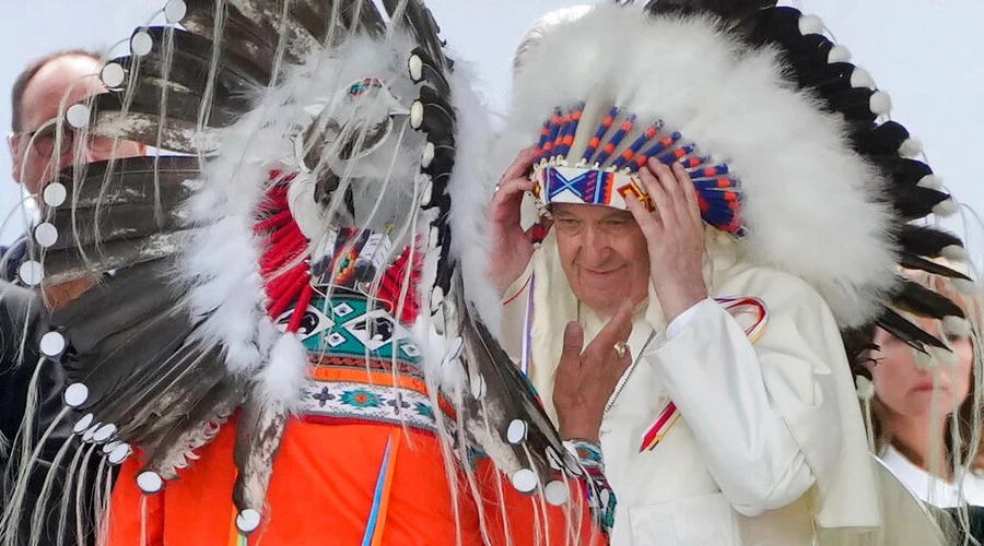Durante su viaje a Canadá a finales de julio de 2022, el Papa Francisco se puso un sombrero de plumas típico de la cultura indígena. Crédito: Vatican Media