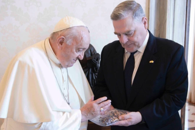 Por su parte, el Papa Francisco le entregó al general estadounidense una escultura que lleva la inscripción: "La paz es una flor frágil”.