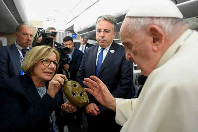 Durante el vuelo a Mongolia, el Papa Francisco bendijo una cantimplora con la que un soldado ucraniano pudo protegerse y evitar la muerte durante un ataque.